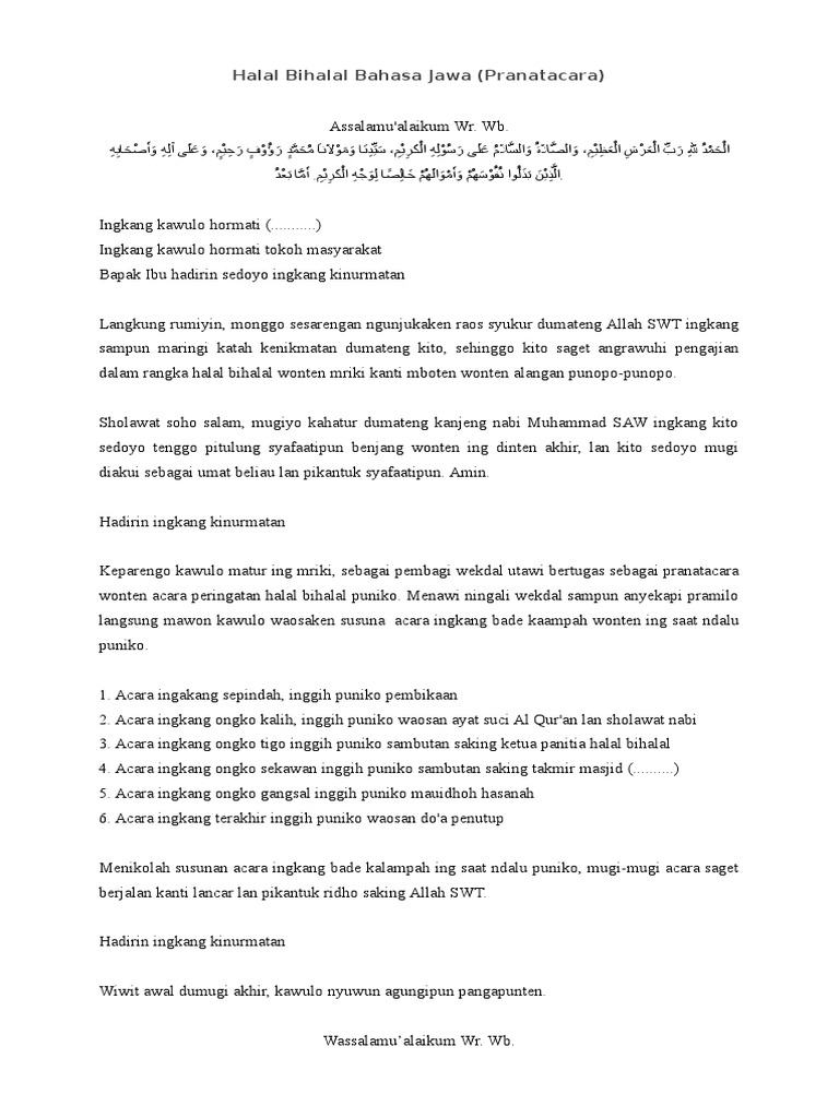 Pada postingan ini, saya akan berbagi sebuah naskah pranatacara dalam bahasa jawa pada acara pengajian, baik itu pengajian rutin, maupun pengajian akbar tahunan. Kumpulan contoh teks pranatacara bahasa jawa. Pembukaan acara arisan rt struktur teks eksposisi pidato persuasif susunan acara aqiqah bahasa jawa pembukaan tahlilan bahasa sunda. Maka kata pranatacara atau pranotocoro hampir selalu diikuti atau dipasangkan dengan kata bahasa jawa. Dalam bahasa indonesia kita sering menyebutnya sebagai pembawa acara.